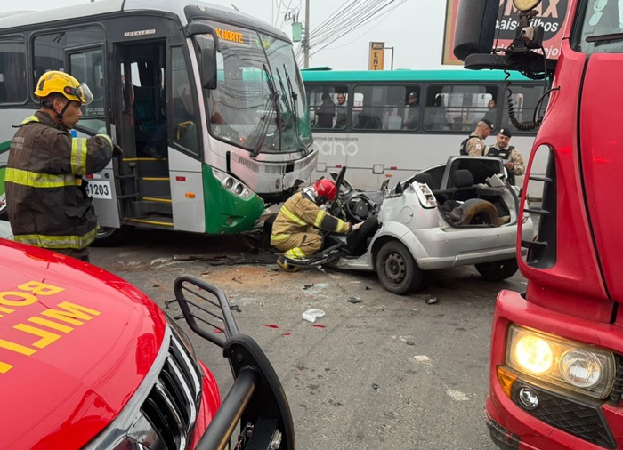 Colisão entre ônibus e carro deixa motorista gravemente ferido e preso às ferragens em Juiz de Fora.