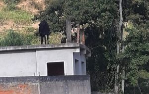 Aos poucos eles foram ” tocando” o animal até que este chegou a um determinado ponto da laje onde é mais baixo, de onde acabou pulando e caindo no quintal sem que isto lhe causasse qualquer ferimento.
