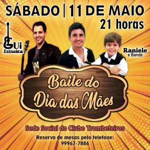 Uma ótima pedida para aqueles que querem curtir uma noite gostosa com boa música e com uma homenagem á sua mamãe. Acontecerá neste sábado 11 de maio, na sede social do Clube Trombeteiros de Momo na Praça Coronel José Brás em São João Nepomuceno, o Baile das Mães com Gui Santana e logo após Raniele e Banda.Ainda de quebra, o baile terá a participação do “pequeno gigante” João , filho de Raniele Quina que já desponta mesmo pequeno como uma promessa para um futuro bem próximo.
