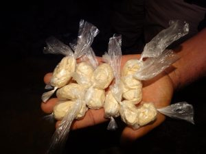 Na fuga tentou dispensar 10 sacolés plásticos contendo em seu interior a quantidade total de 80 papelotes de uma substância esbranquiçada semelhante à cocaína. Em seguida na residência do mesmo na Rua Alício Mariano da Silva, no bairro São Pedro, lá estavam três indivíduos (dois maiores e um menor), sendo que dois deles se encontravam no momento “endolando” grande quantidade da mesma substância, dois já com várias passagens por tráfico de drogas e crimes contra o patrimônio.
