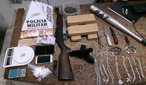 1 Carabina calibre .22, 17 munições calibre .22; 1 carregador para carabina calibre 22; 1 Pistola Airsoft; 4 Kg de maconha; 1 porção de maconha;1 porção de crack; 2 Balanças de precisão; R$ 1.750,00 reais; 2 soco inglês; 1 faca; 3 canivetes;