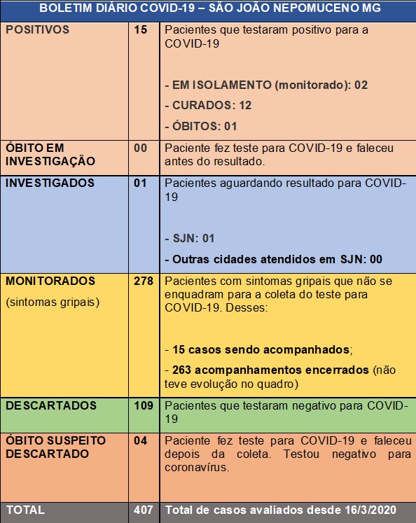 DESDE O DIA 16 /03 OU SEJA APÓS QUASE 100 DIAS , FORAM AVALIADOS 407 CASOS EM SÃO JOÃO NEPOMUCENO. DESTES 14 TESTARAM POSITIVO SENDO QUE 12 DESTES JÁ SE CURARAM. HOUVE UM ÓBITO REGISTRADO PARA SÃO JOÃO NEPOMUCENO DE UMA SENHORA DO DISTRITO DE ROÇA GRANDE QUE PASSOU POR PROCEDIMENTO CIRÚRGICO EM JUIZ DE FORA E APÓS O FALECIMENTO AINDA NO HOSPITAL, UM TESTE RÁPIDO DA UFJF ACUSOU POSITIVO.