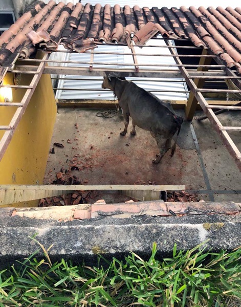 06/29/2020Uma vaca caiu sobre um telhado por volta das 5 horas desta segunda-feira, 29 de junho, na Avenida Ministro José Fabrino Baião, altura do número 500, no Bairro Thomé, em Cataguases.