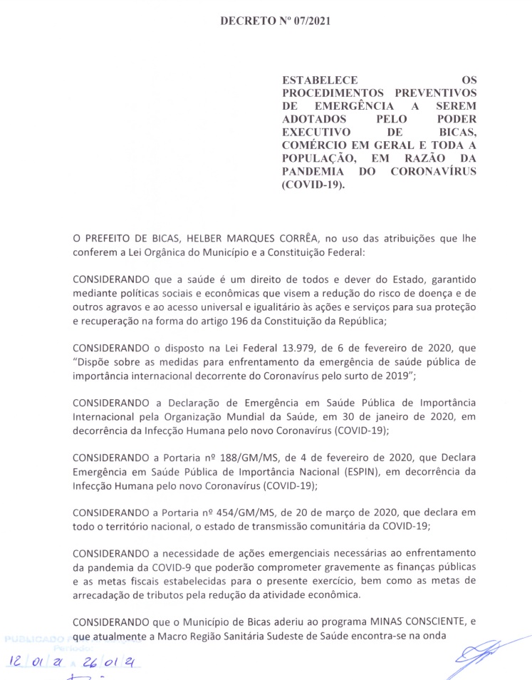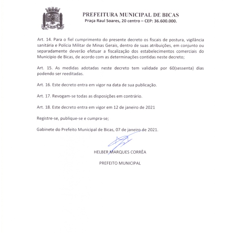 01/13/2021O prefeito de Bicas MG, Hélber Marques Correa, assinou nesta terça-feira 12 de janeiro o Decreto nr: 07/2021que estabelece procedimentos preventivos de emergência adotadas em razão da pandemia do novo coronavírus.