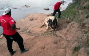 Segundo informações do coordenador da Defesa Civil de Cataguases, Alexandre Rodrigues, o Tico Tico, na quarta-feira, 1º de setembro, o mesmo animal caiu no rio Pomba e sua equipe foi acionada para retirá-lo. Hoje, pela manhã, a vaca retornou ao local e o acidente se repetiu. Dessa vez, o trabalho de resgate contou com a equipe do Corpo de Bombeiros e foi mais “difícil e demorado”, provavelmente em função do cansaço pelo fato de, em pouco mais de 12 horas, ela ter atolado duas vezes, avalia.