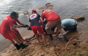 Nesta manhã as duas equipes se uniram para retirar a vaca que estava dentro do rio Pomba, onde passou a noite, próximo a ponte da “estrada da Empa”, em local de difícil acesso. Ao longo de quatro horas, tempo aproximado para concluir a operação, foram utilizadas amarrações e técnicas de salvamento para que o animal chegasse próximo do local onde uma retroescavadeira ajudou no seu resgate. Antes de chegar em terra firme, a vaca foi puxada por cordas até um local seguro e depois foi deixada aos cuidados de seu proprietário.