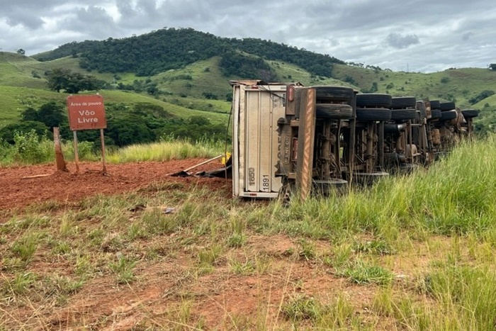Motorista perde controle e carreta atravessa pista da BR-116 em Leopoldina