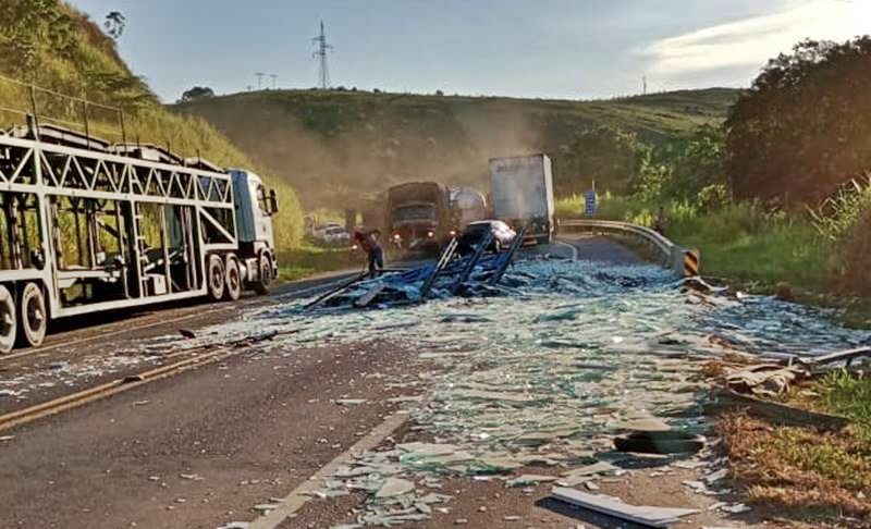 Carga de vidro se solta de caminhão na BR-116 em Leopoldina