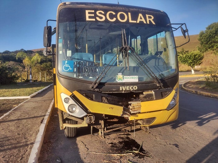 Ônibus escolar de Rochedo colide contra boi solto na pista perto do trevo para Roça Grande.