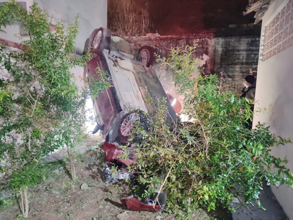 Carro desce ribanceira, capota e cai em quintal de casa em Muriaé.
