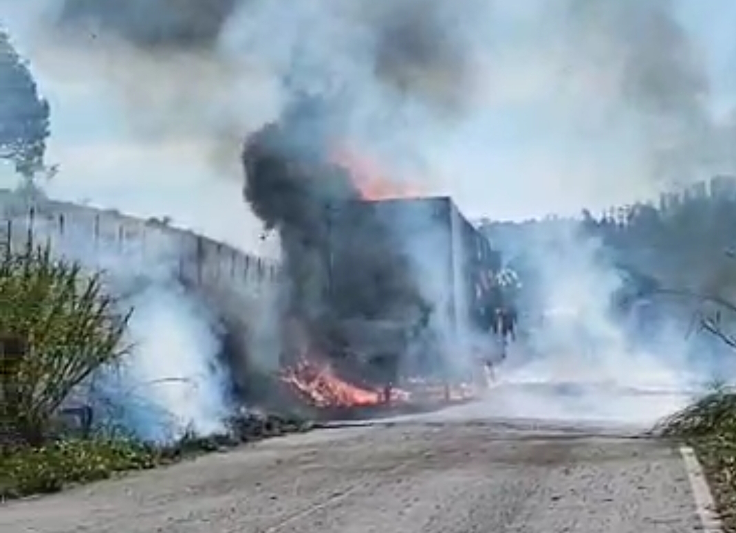 Reboque de carreta carregada com móveis pega fogo na MG 133 em Rio Novo.