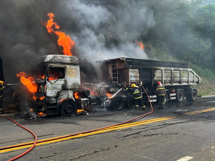Cabine de carreta é destruída após incêndio na BR-116 em Muriaé