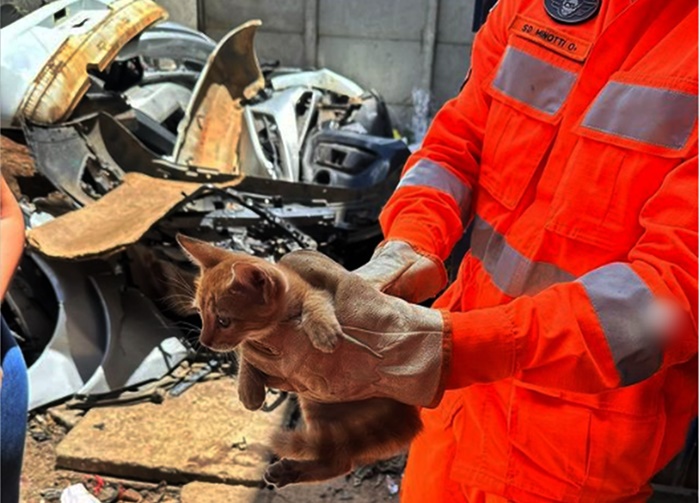 Bombeiros resgatam gato preso entre motor e para-choque de carro em Muriaé.
