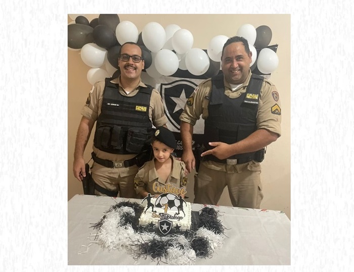 03/17/2024A Polícia Militar foi convidada neste sábado 16 de março, para comparecer e parabenizar o pequeno Heitor, completando seus 03 aninhos. O sargento Carpeggiane e o cabo Aglio representaram a corporação e marcaram presença na festa de uma criança adorável.