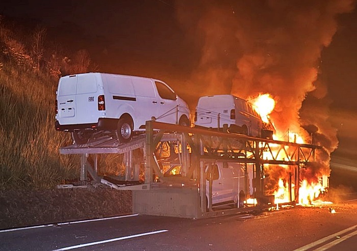 Carreta bate em barranco, tomba e fica atravessada na BR-116, em Muriaé