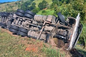 Uma carreta tombou após o motorista, de 34 anos, perder o controle direcional ao fazer uma curva à direita, invadindo a contramão de direção e saindo da pista de rolamento.