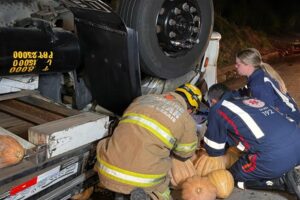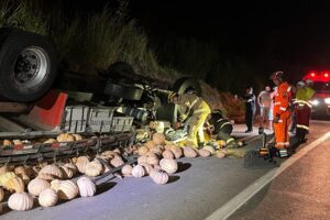 02/19/2025Um trágico acidente ocorreu na noite desta terça-feira (18/02), por volta das 23h30, na BR-116, entre Miradouro e Fervedouro, próximo à praça do pedágio. Um caminhão carregado de abóboras tombou, resultando na morte do motorista, Hellivelton Soares Franco, de 30 anos, natural de Santo Antônio de Pádua (RJ). Ele ficou preso nas ferragens e não resistiu aos ferimentos.