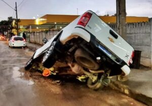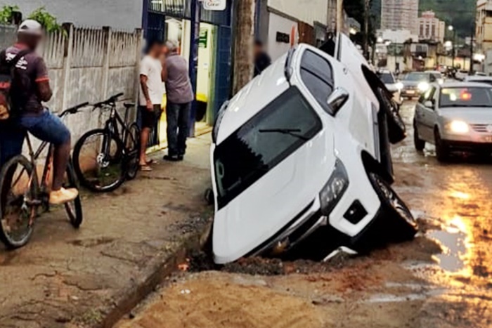 De acordo com relatos, o veículo estava estacionado na rua e, ao sair, o motorista não percebeu o buraco e caiu com a frente da caminhonete. Felizmente, não houve registro de feridos.