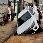 Caminhonete cai em buraco de obra sinalizado no centro de Leopoldina
