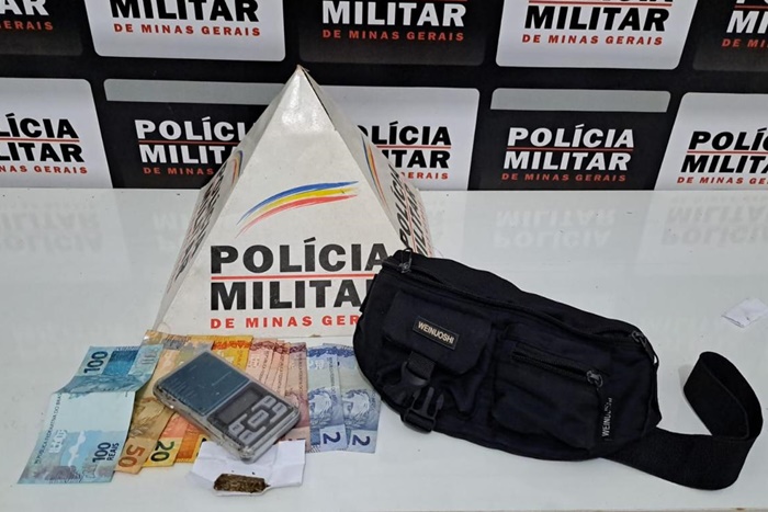 Ao se aproximarem da residência, os militares localizaram um homem negro saindo em disparada para dentro do portão, deixando uma pochete preta pendurada nele. Ao verificar a pochete, os policiais encontraram R$229,00, uma bucha de maconha e uma balança de precisão.