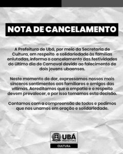 A Prefeitura de Ubá emitiu nota cancelando festejos do último dia da Carnaval em respeito e solidariedade á vítma fatal em Rio Pomba que era ubaense  e pela morte em acidente do filho de um vereador ocorrido também na segunda-feira.
