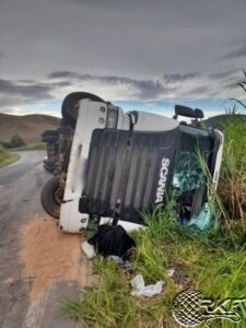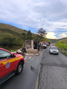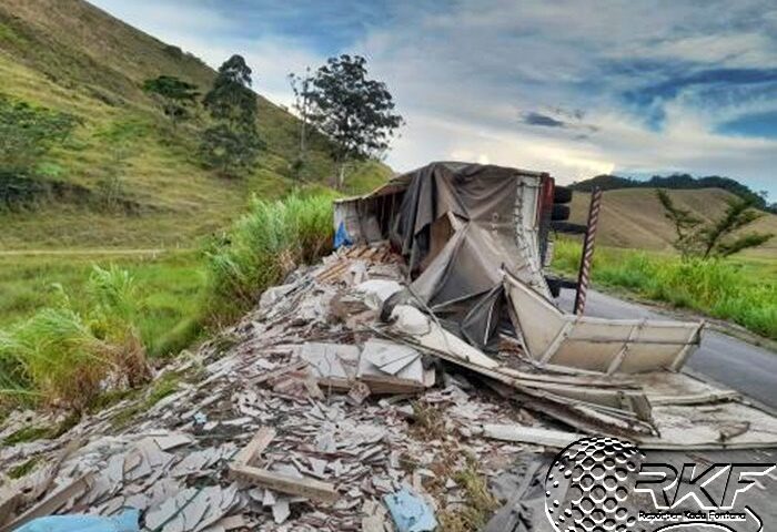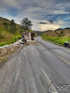 03/12/2025Um acidente envolvendo uma carreta carregada de piso cerâmico ocorreu na tarde de hoje, 12 de março de 2025, por volta das 16 horas, na rodovia BR 267, Km 75. A carreta, que seguia do sentido Juiz de Fora para Bicas, não conseguiu fazer uma curva e tombou, invadindo a contramão e ocupando parte da pista contrária, próximo a um talude.