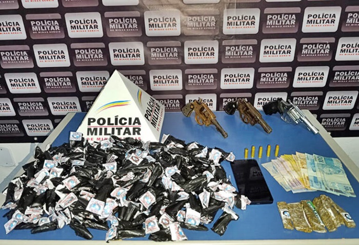 A partir da apreensão, os policiais seguiram até a residência dele, no bairro Terra do Santo. Com a autorização do pai do jovem, a equipe realizou buscas no imóvel, localizando dezenas de pinos de cocaína dentro do colchão do adolescente. Nos fundos da casa, uma sacola plástica escondia mais um revólver calibre .38 sem munição. Além disso, os militares identificaram um ponto de terra remexida, onde um balde enterrado continha mais um revólver, dezenas de pinos de cocaína, tabletes de maconha e uma granada artesanal. Outra granada foi localizada embaixo de um sofá.