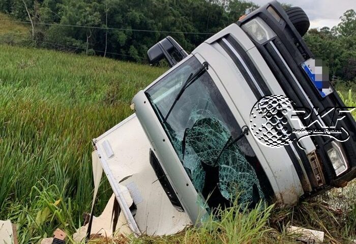 O Caminhão estava tombado fora da pista. De acordo com a PRF o caminhão levava produtos de hortifrutti do CEASA para a cidade de Bicas.