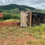 Carreta com minério tomba e motorista fica ferido em Muriaé.