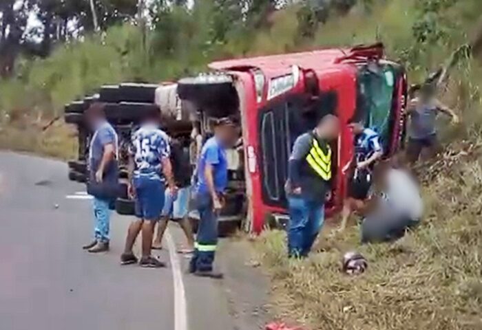 Caminhão tomba e motorista fica ferido entre Ubá e Rodeiro.
