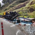Carreta carregada com vidros tomba na BR-116 em Leopoldina.