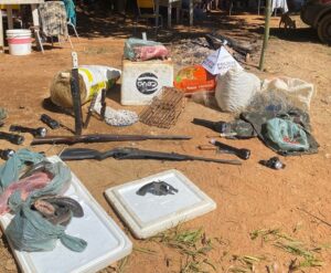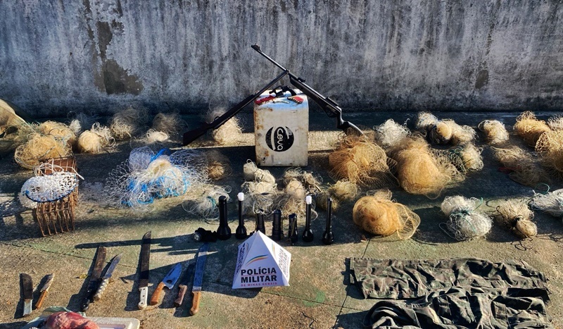 05/23/2025Uma operação realizada pela Polícia Militar de Meio Ambiente (4ª CIA, 2º Pelotão, 4º Grupamento) flagrou na manhã desta quinta-feira, 22 de maio, um acampamento com vários indivíduos envolvidos em atividades ilegais de caça e pesca predatória em uma área rural de Leopoldina. O grupo utilizava armas de fogo, cães e equipamentos proibidos para capturar animais silvestres e peixes, sem qualquer tipo de licença ambiental.
