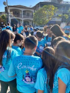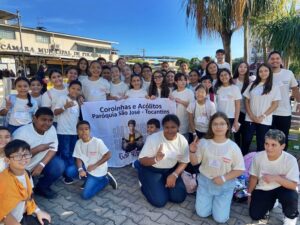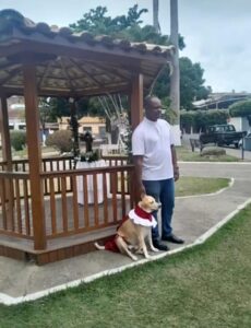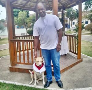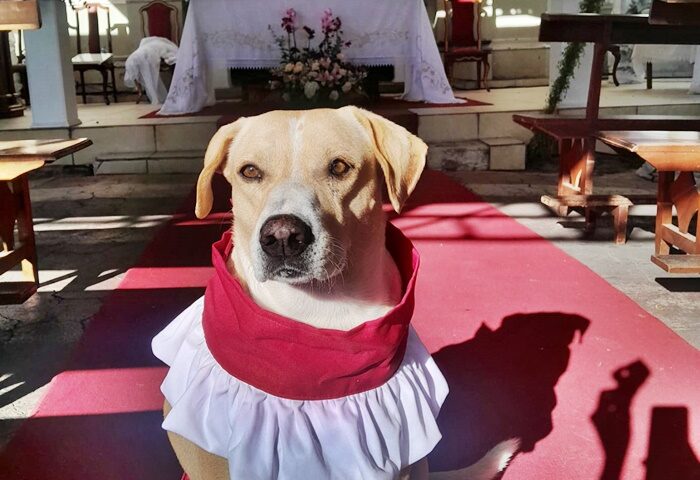 Inclusive, Lígia foi quem confeccionou as vestes nas quais “Amarelo” aparece no vídeo que viralizou durante o encontro de domingo. O padre disse que estava receoso porque o cachorro nunca havia ficado no meio de tanta gente, mas quando ele foi anunciado no altar, a interação foi total.