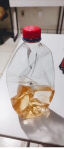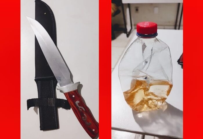 A faca e a garrafa com gasolina foram apreendidas.