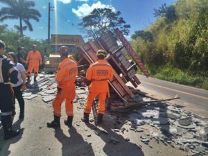 Conforme constatado no local, a carga correu durante a manobra, o que comprometeu a estabilidade do veículo e provocou o tombamento. Ao tombar, o caminhão colidiu com outro caminhão que se encontrava parado no acostamento da via.
