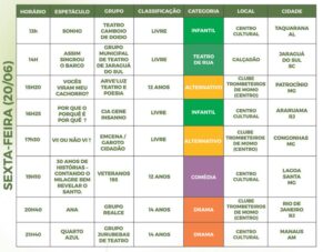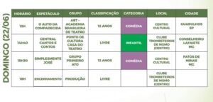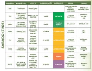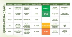 06/19/2025Entre os dias 19 e 22 de junho, durante o feriado prolongado de Corpus Christi, São João Nepomuceno será palco do 17º Festival Nacional de Teatro, um dos mais importantes eventos culturais do município. A programação reúne espetáculos gratuitos nas categorias alternativo, drama, comédia, infantil e teatro de rua, apresentados em diversos pontos da cidade.