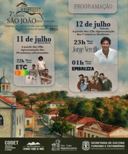 06/23/2025A sétima edição do Festival da Canção de São João Nepomuceno, o Canta São João – troféu Paulinho Cri será realizado nos dias 11 e 12 de julho de 2025, no distrito de Taruaçu, ao lado da Igreja Nossa Senhora das Dores, com apresentações de músicas autorais (festival competitivo) e shows musicais.