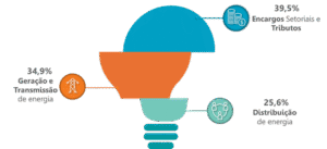 O peso de cada uma dessas cobranças pode variar por estado e por distribuidora. De maneira didática, podemos comparar a conta de energia a uma pizza, em que o valor total se divide em fatias que vão para os respectivos órgãos e empresas responsáveis pelos serviços como no modelo a seguir: