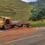 Caminhão carregado com tijolos tomba na Serra de Pirapanema em Muriaé
