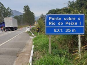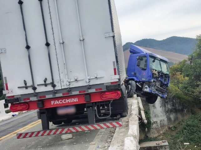 08/05/2025Um caminhão ficoi com a frente pendurada em uma ponte sobre o rio do Peixe, no início da manhã desta terça-feira, 05/08, no Km 139 da BR-267, perto do Rancho Canabrava, nas proximidades do distrito de Valadares, em Juiz de Fora MG.