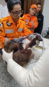 A segunda ocorrência aconteceu no distrito de Penido, também em Juiz de Fora, onde moradores encontraram e contiveram uma ave de rapina de grande porte, possivelmente uma Águia-cinzenta, debilitada e com sinais de ferimentos. O animal, com envergadura de aproximadamente dois metros, foi contido com segurança pelos bombeiros e transportado até o Batalhão. Na unidade, passou por avaliação da médica veterinária do CETAS, sendo posteriormente encaminhado ao IBAMA para tratamento especializado.