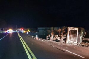 08/17/2025Neste sábado por volta das 18h30, ocorreu um tombamento seguido de colisão lateral em sentido oposto, envolvendo uma carreta com carregamento de vidro e uma caminhonete no km 774 da BR 116 em Leopoldina-MG, resultando em uma pessoa ferida e 4 ilesas.