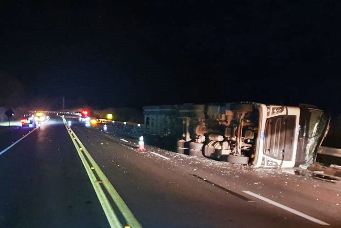 Conforme apuração no local, ao tombar, o veículo de carga invadiu a faixa de sentido oposto atingido lateralmente a caminhonete, ficando a carreta imobilizada junto à defensa metálica e ocasionando o capotamento da caminhonete.