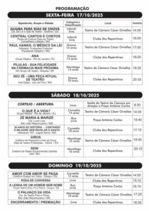 O evento reunirá 15 grupos teatrais vindos de diferentes regiões do país, com a participação de cerca de 100 artistas e técnicos, em apresentações de comédia, drama, infantil, monólogo e teatro de rua.