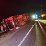 Carreta carregada com frutas sai da pista e tomba na BR-116 em Leopoldina