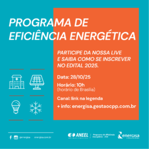 Está aberta a chamada pública do Grupo Energisa para seleção de projetos no âmbito do Programa de Eficiência Energética (PEE), regulado pela Aneel. A iniciativa incentiva o uso consciente da energia elétrica, com foco em soluções sustentáveis e combate ao desperdício. Os recursos do programa podem ser destinados a projetos rurais, de infraestrutura de iluminação pública, organizações sociais e órgãos públicos. Todos os clientes das áreas de concessão das distribuidoras do Grupo podem participar. O edital fica disponível até 19 de dezembro. As regras serão apresentadas em uma live nesta terça-feira (28/10), às 10h (horário de Brasília), pelo link.