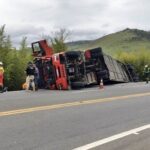 Carreta cegonha com 11 veículos tomba na BR-116, em Leopoldina