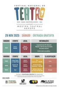 11/18/2025O Nepopó está de volta! A Mostra Teatral Nepopó, evento que marca o início das atividades da 18ª edição do Festival Nacional de Teatro de São João Nepomuceno, que vai ter conversa, reencontro e, claro, muito teatro — com três espetáculos gratuitos para todas as idades tudo isso em 29 de novembro de no Museu Municipal e Centro Cultural