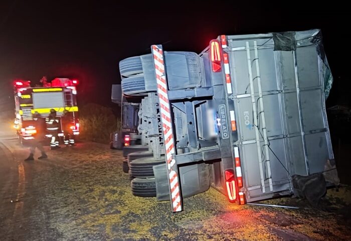 Uma carreta carregada com milho tombou na rodovia MGC 265 KM 131 em Mercês MG, por volta das 18 horas desta segunda-feira 24/11. O semirreboque tombou sobre o acostamento e parte da pista, espalhando a carga. O condutor de 64 anos foi encontrado sem vida, com óbito confirmado pelo SAMU. A perícia liberou o local remotamente. A funerária realizou a remoção do corpo.