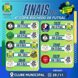 11/26/2025A 4° Copa Rochedo de Futsal Infantil 2025 chega á sua decisão no próximo sábado 29 de novembro. As finais serão disputadas na quadra do Clube Municipal no centro de Rochedo de Minas. A realização é da Prefeitura Municipal e do Departamento de Esportes.
